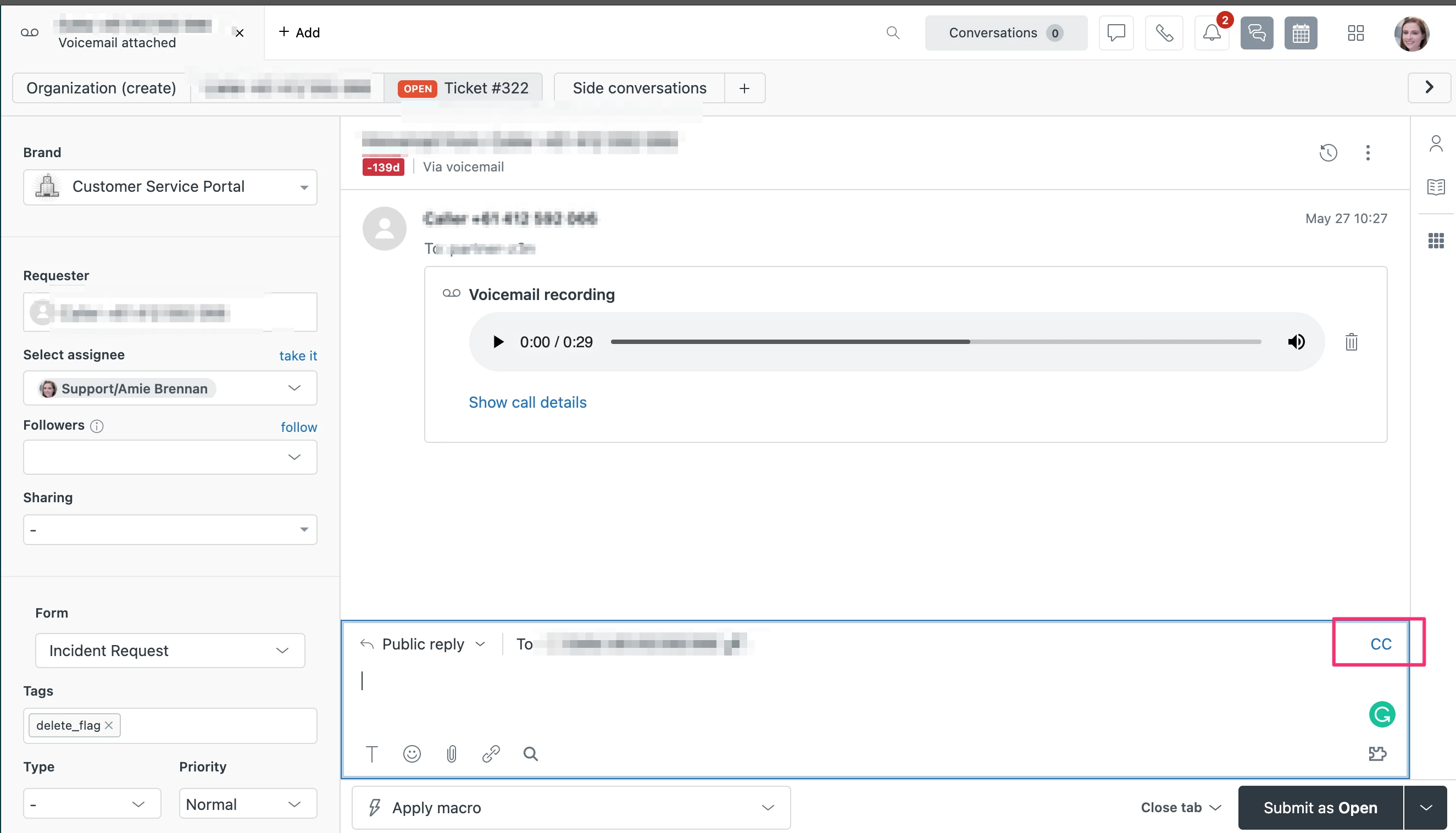 But when viewing a ticket, there is no "CC" box for me to add the end user I want to be copied in on responses. What do I need to do to see the "CC" box?