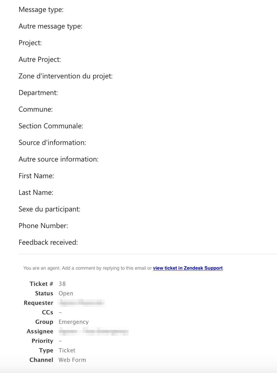 As you can see, none of the fields have any actual data, only the labels can be seen. The ticket actually has data for those fields, but it's not displayed.