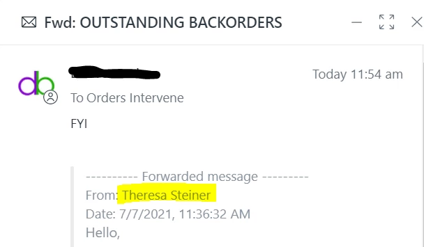 I forwarded the email from Theresa Steiner to a 3rd party using the Forward via Email functionality in the ZD ticket, but the 3rd party only sees the name "Theresa Steiner" (no email address,and no hyperlink either) on the email that they received from me, thereby preventing them from being able to respond to Theresa directly because they dont have her email address! They end up responding to me, and so I then have to forward their response to Theresa myself!