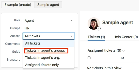 In addtion, when you add agents to groups, define their privileges on their profile page. One of those privileges is called Access. This defines the agent's access to tickets. Select Tickets in agent's groups.