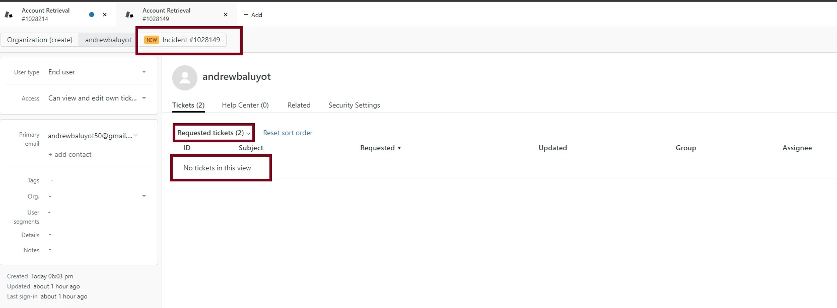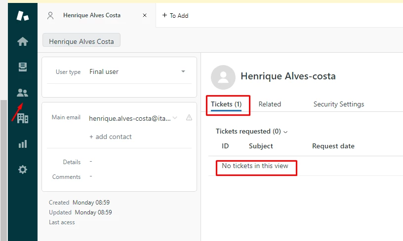 Can you select the drop-down option next to Tickets requested (0) and see if there's any tickets that the user is CC'd on? I'm thinking that is why it's showing 1 ticket under the users profile which is expected behavior.