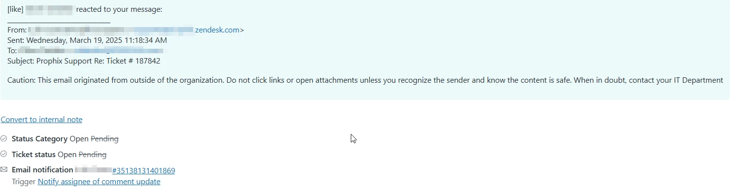 At this time, Zendesk doesn’t have a native setting to automatically ignore or filter out reaction-based updates that come through email notifications (for example, when recipients “like” or “react” to a message in certain mail clients). These reactions are processed as standard inbound email replies, which is why they appear as new comments and can re-open tickets.