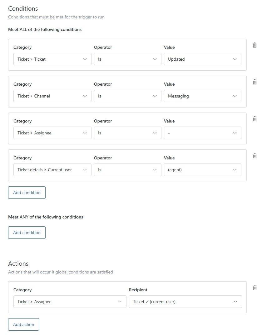 We respond to many Messaging tickets daily, but our agents must use up their valuable time assigning the ticket to themselves and updating the status, before being able to respond to the Customer.