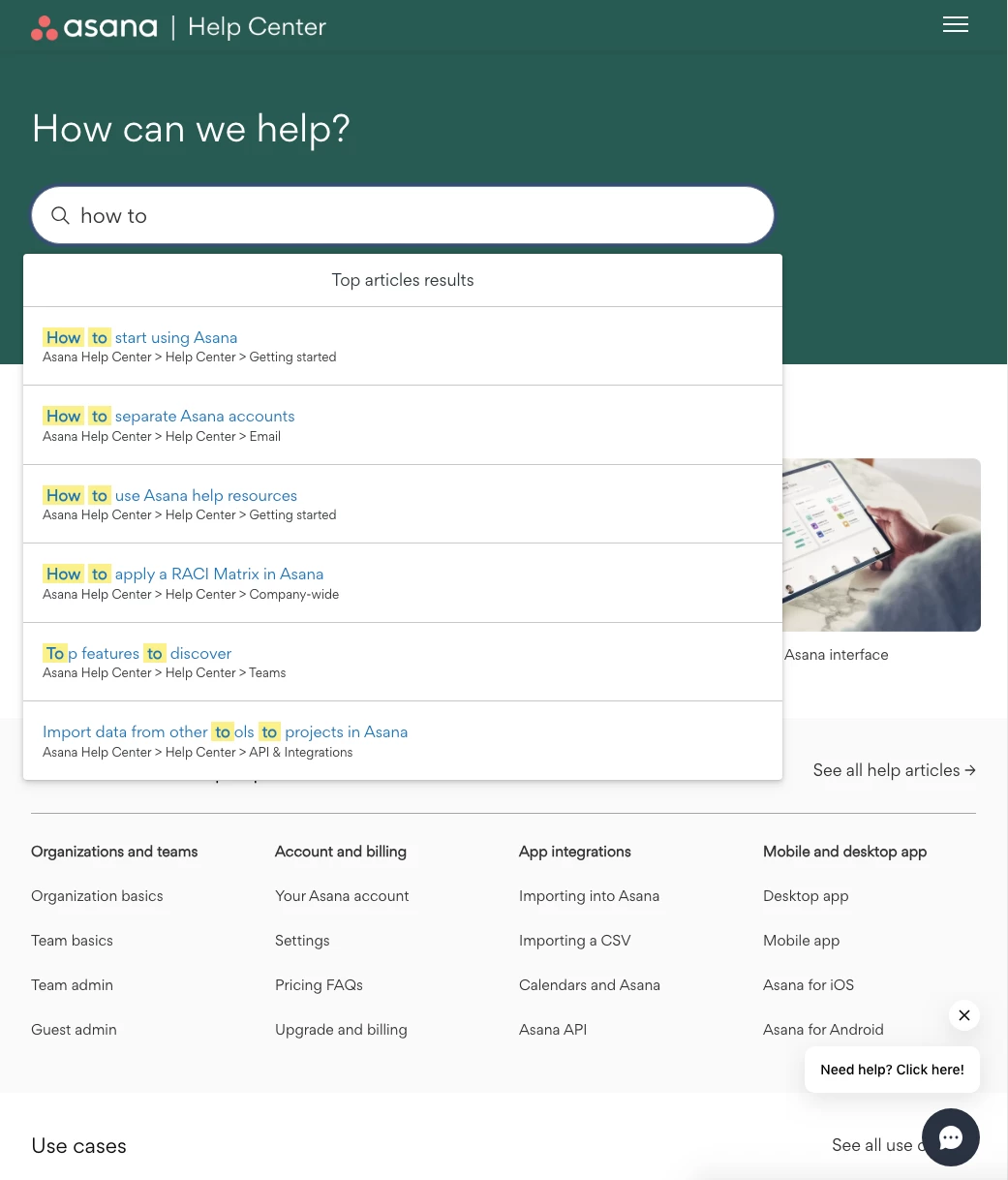 Hello, We have an issue with the search suggestions pop up on our support center, and I thought I'd show you what I mean using Asana's support center as an example