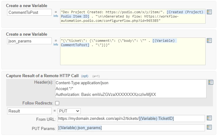 We are trying to use Podio's globiflow to interact with ZenDesk tickets. After many attempts, we have it able to post an internal comment to a ticket using this: