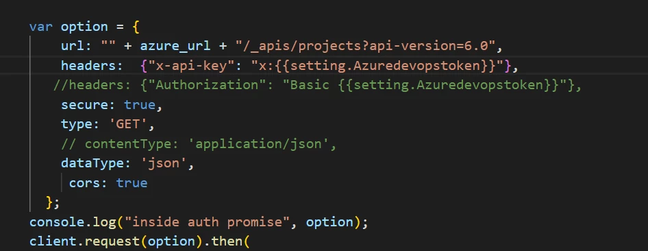 We are able to access the api if we use basic authorization.but if we substitute it with {{settings.Azuredevopstoken}} we are unable to perform btoa.
