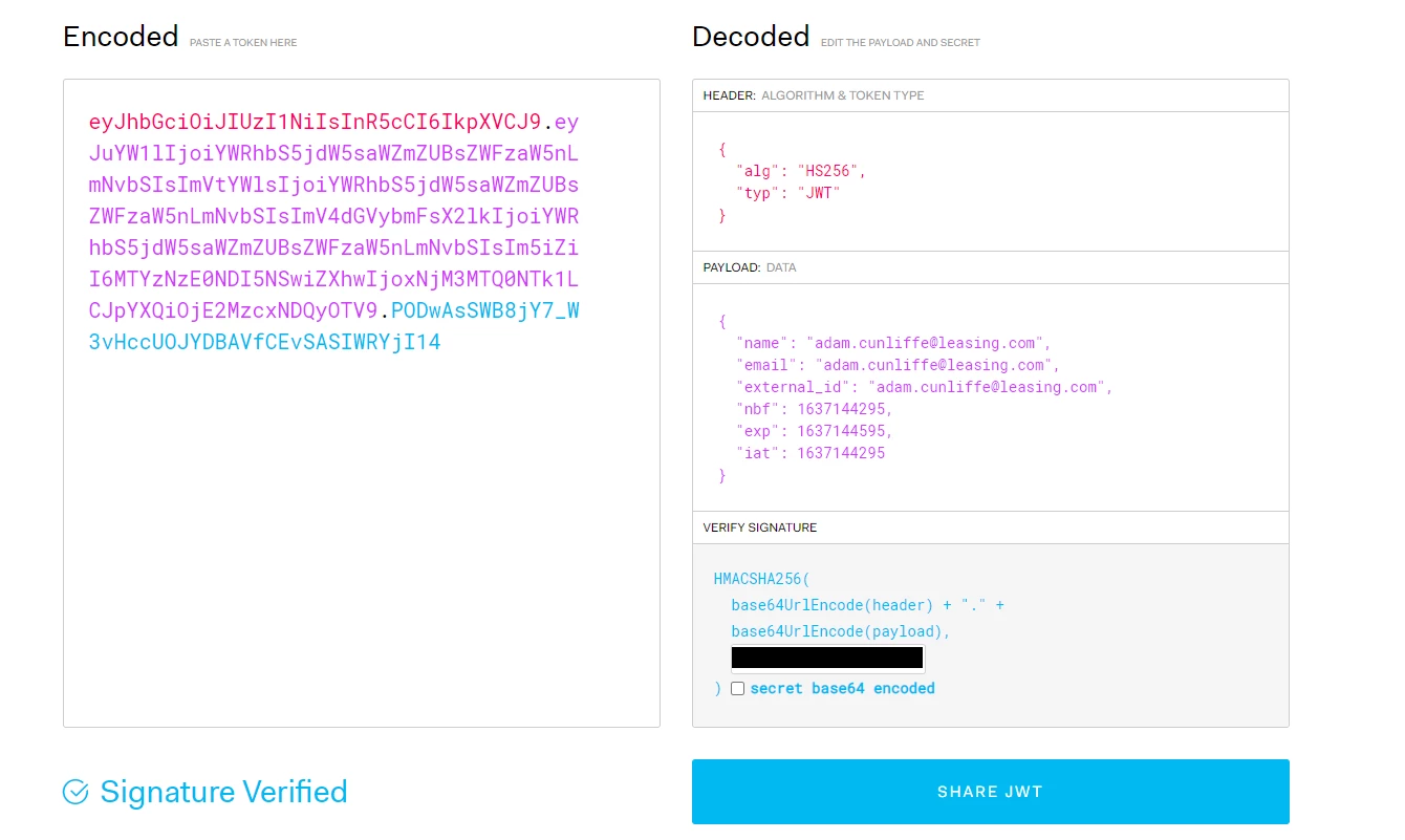 I have verified that the secret being used for JWT generation is correct, and the JWT itself looks valid when using the debugger on jwt.io. It also contains the payload specified by the above article: