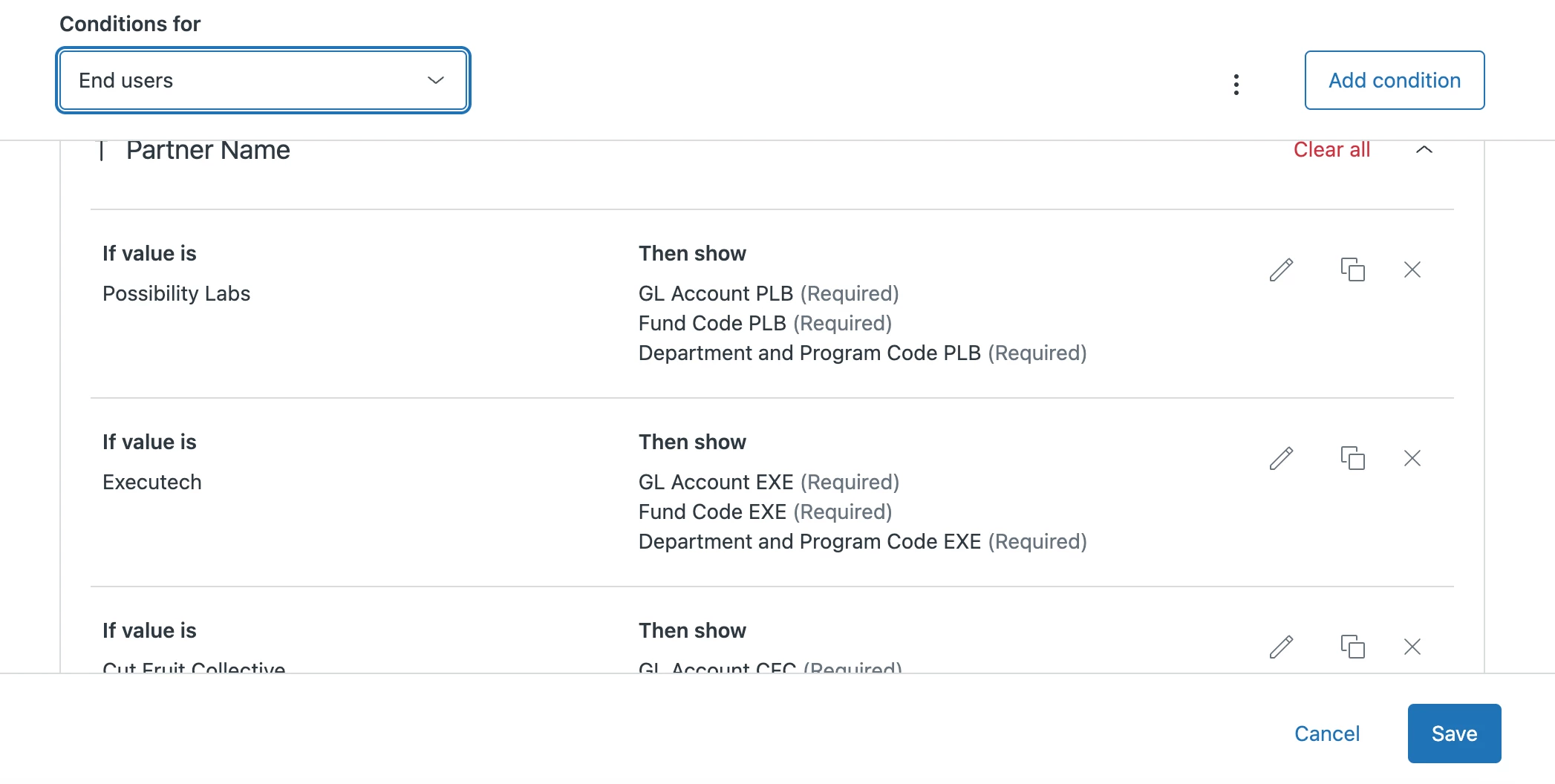 Below is the code for presetting the "Partner Name" value, and I attached a screenshot of the conditional fields logic.