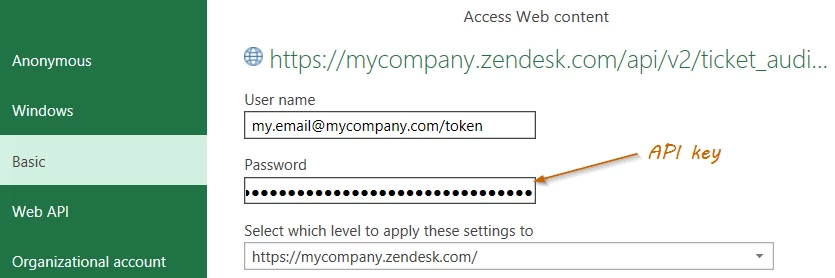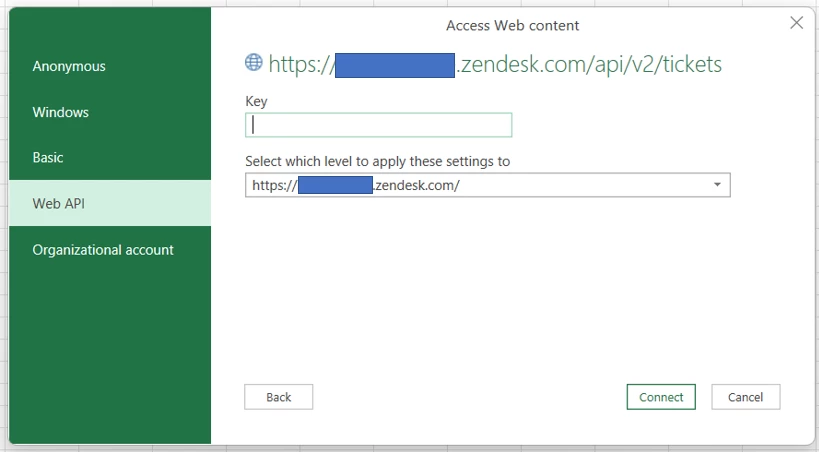 I'm looking to connect Zendesk with Excel Power Query using the API, however, all of the authentication methods that are provided when trying to connect the data source don't allow me to connect.