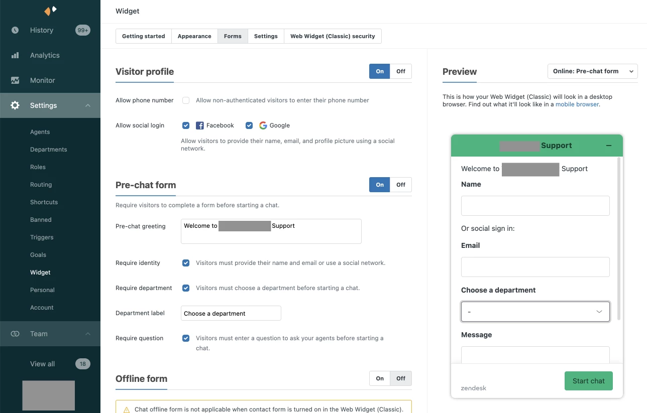 First, I check the settings in Chat > Settings > Widget > Forms and mark the tick to require department.