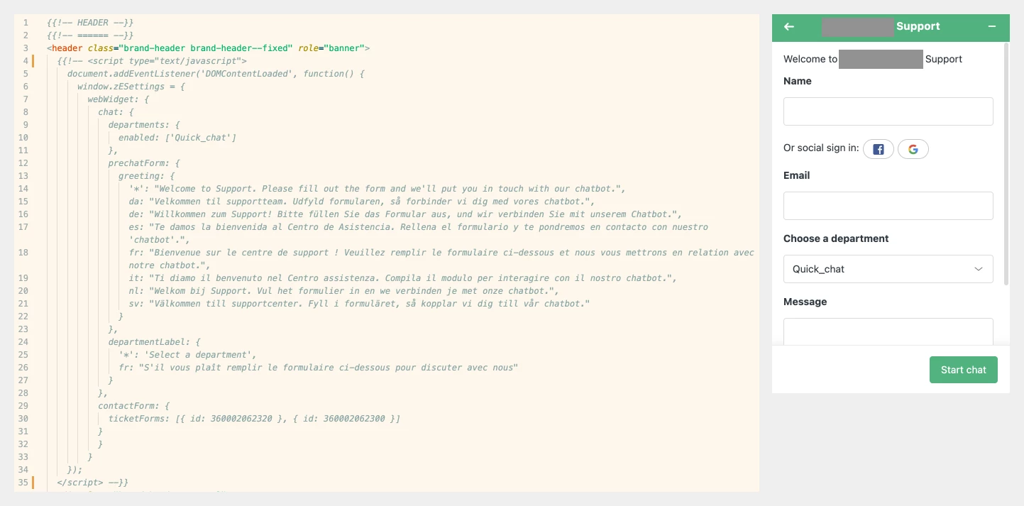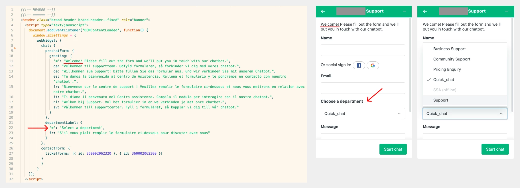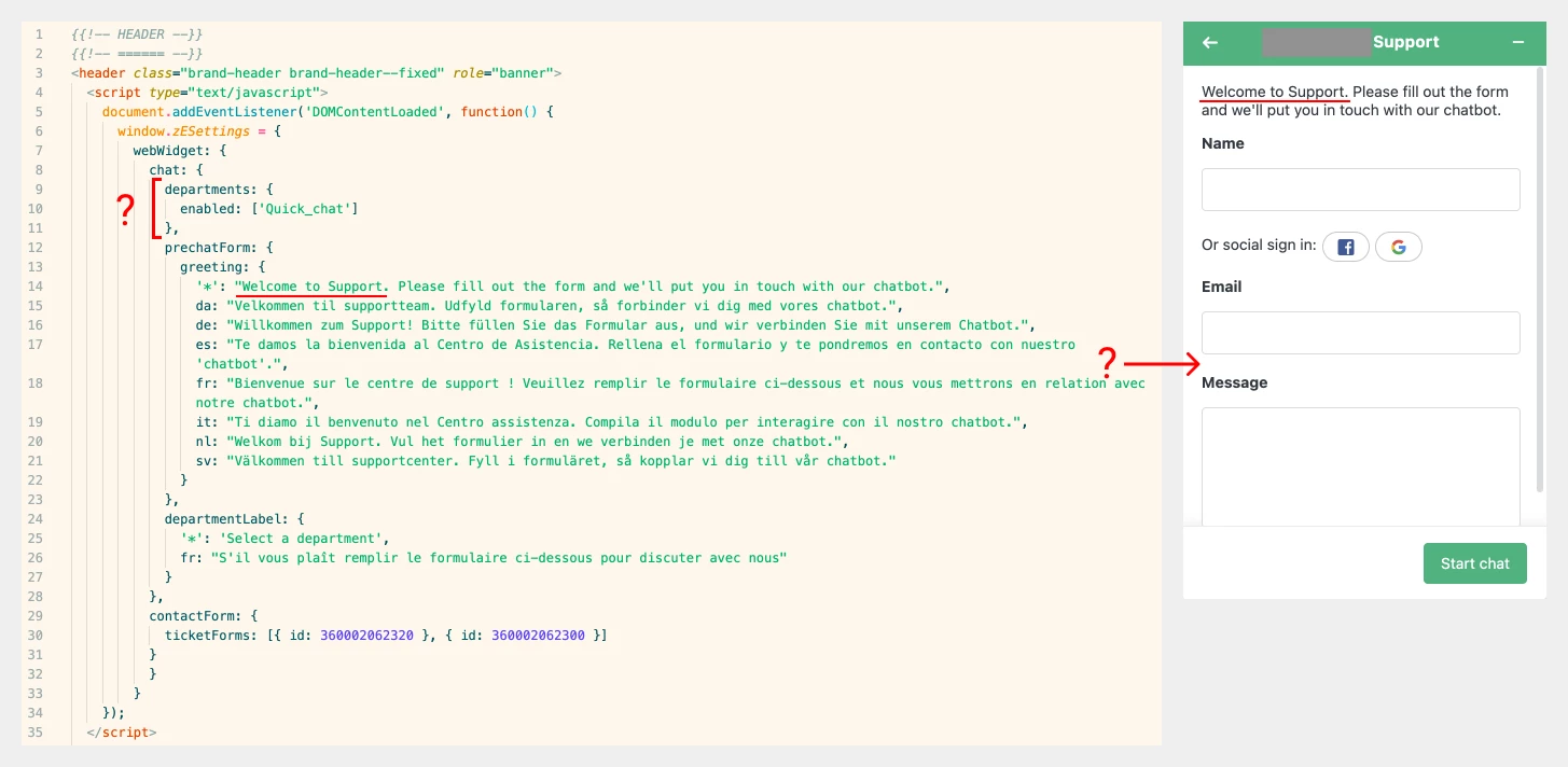 If I use my custom code, I see that the change I made in the greeting message is applied, but I don't see the departments dropdown enabled in the pre-chat form.