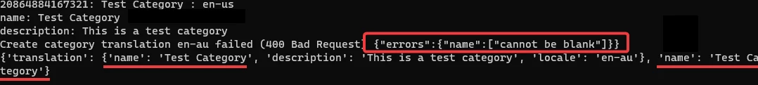 There is an error in validation for creating translations for categories and sections. The returned error is "Name cannot be blank" however what it is actually validating on is "Title."