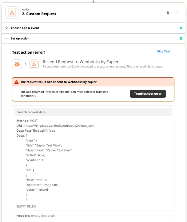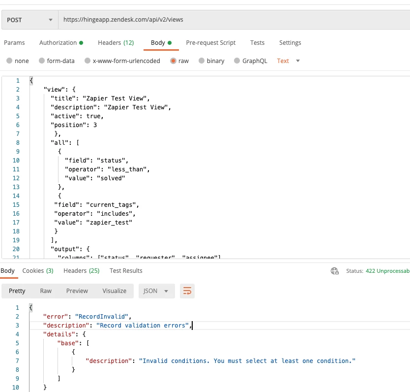 Hello! I'm hitting the error "Invalid conditions. You must select at least one condition." when I attempt to create a view via the API using Zapier.