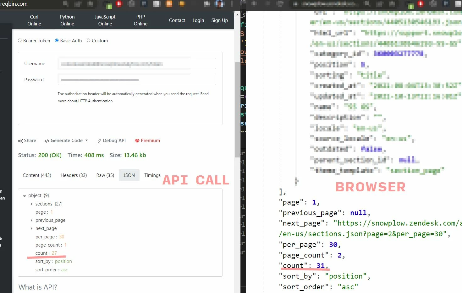 * Using the same endpoint, empty sections are listed in a browser — they are not returned via API call