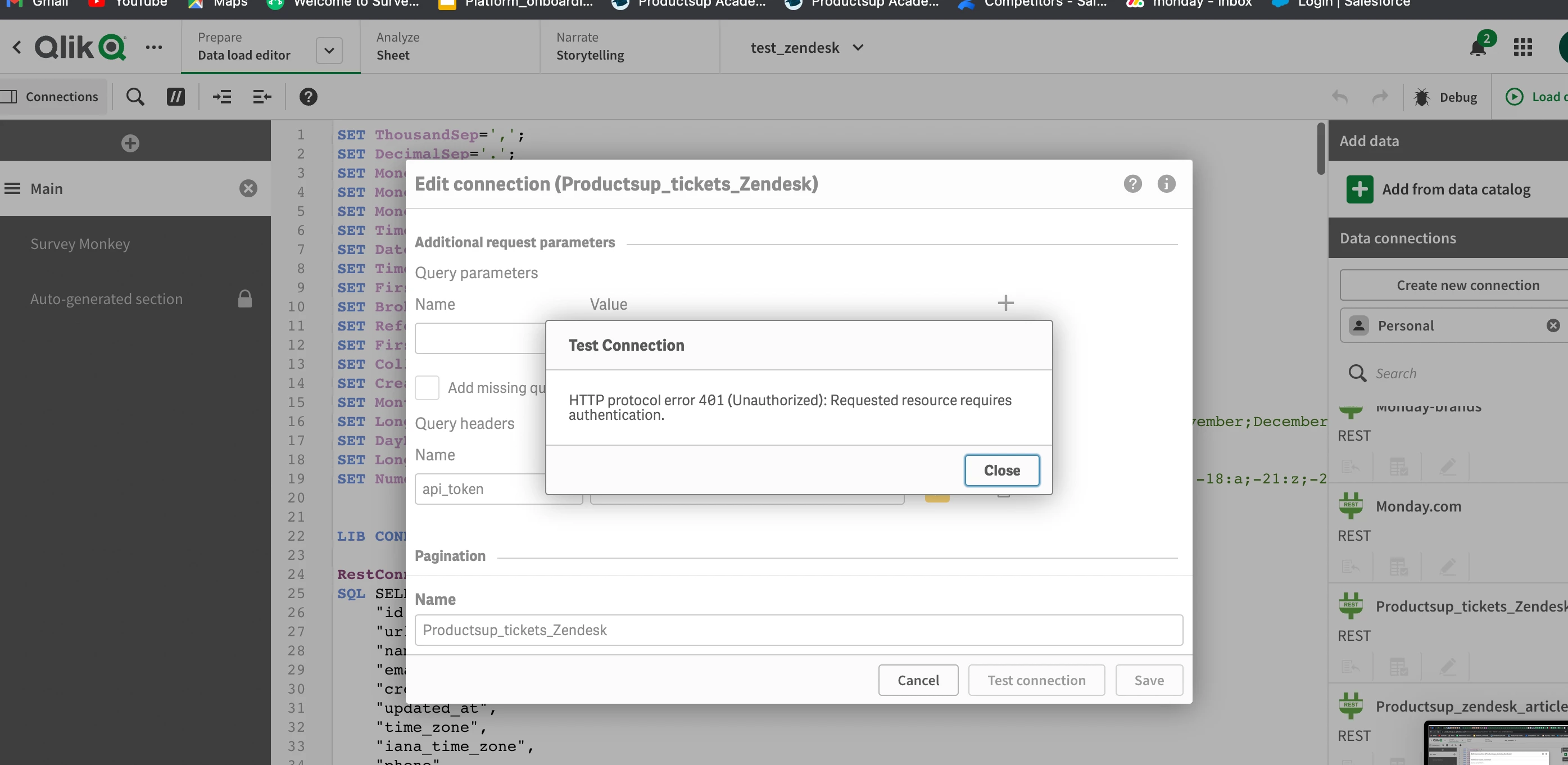 While connecting to zendesk from qlik, I am now facing 401 Error ,though I used same username and password with basic authentication of schema to fetch the data earlier.