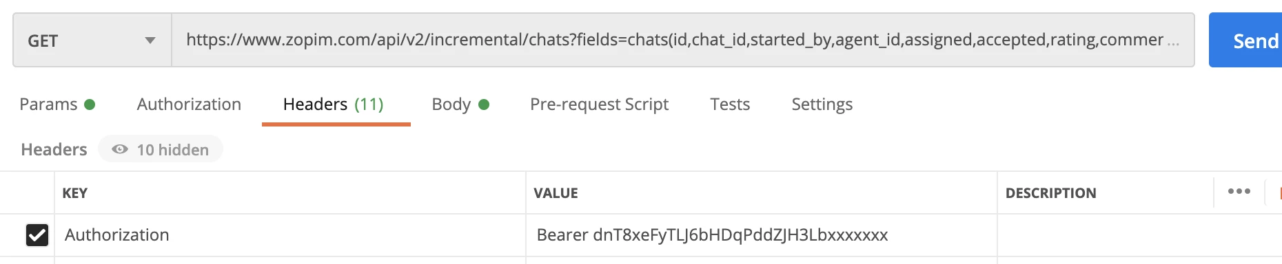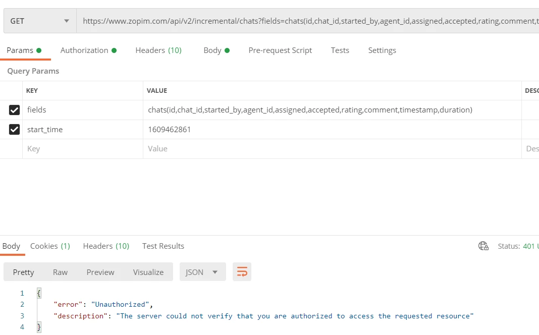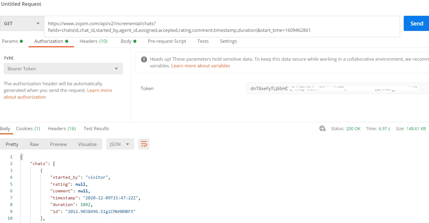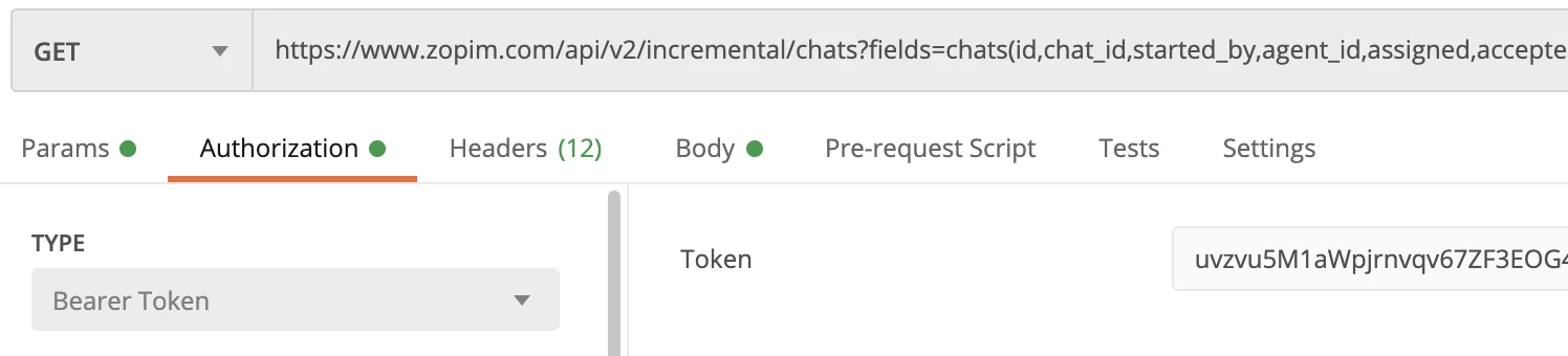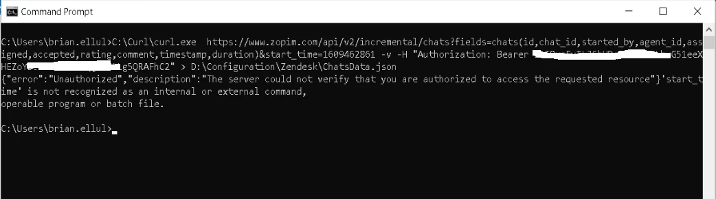 https://www.zopim.com/api/v2/incremental/chats?fields=chats(id,chat_id,started_by,agent_id,assigned,accepted,rating,comment,timestamp,duration)?start_time=1609462861 -v -H "Authorization: Bearer xxxxxxxxxxxxxxxxxxxxx