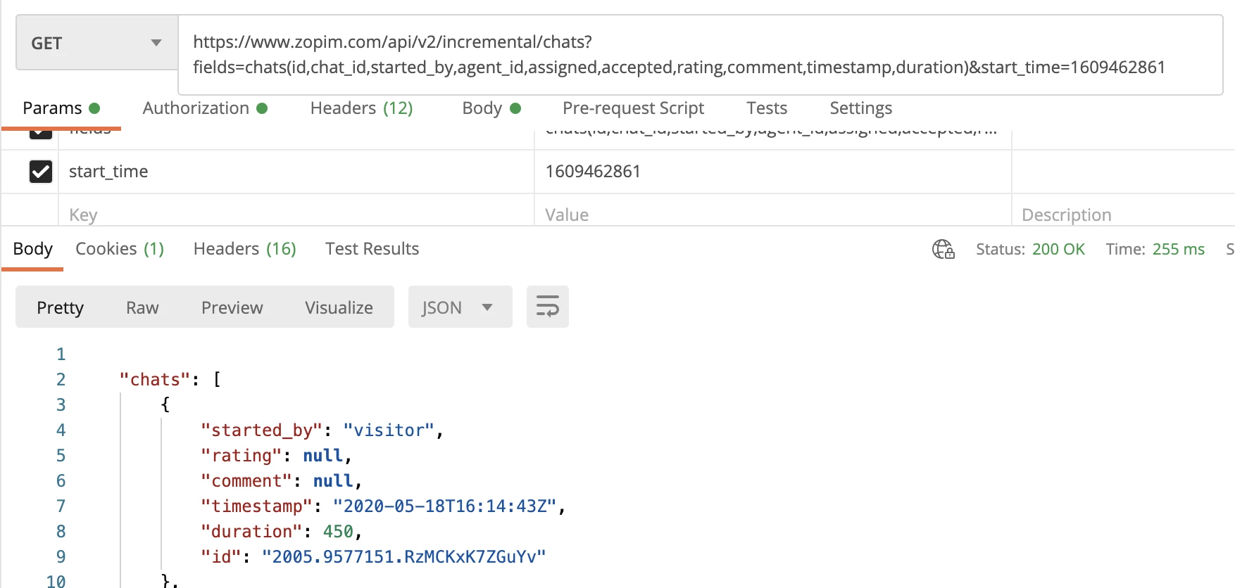 https://www.zopim.com/api/v2/incremental/chats?fields=chats(id,chat_id,started_by,agent_id,assigned,accepted,rating,comment,timestamp,duration)&start_time=1609462861