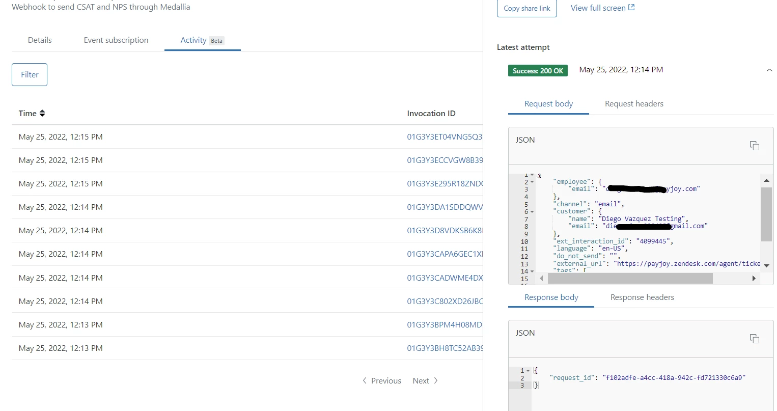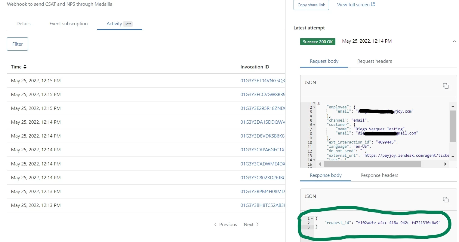 I believe this is the API that you're looking for: https://developer.zendesk.com/api-reference/event-connectors/webhooks/webhooks/#list-webhook-invocation-attempts. This endpoint will provide you with the body and headers for both the request and response for each attempt for an invocation.