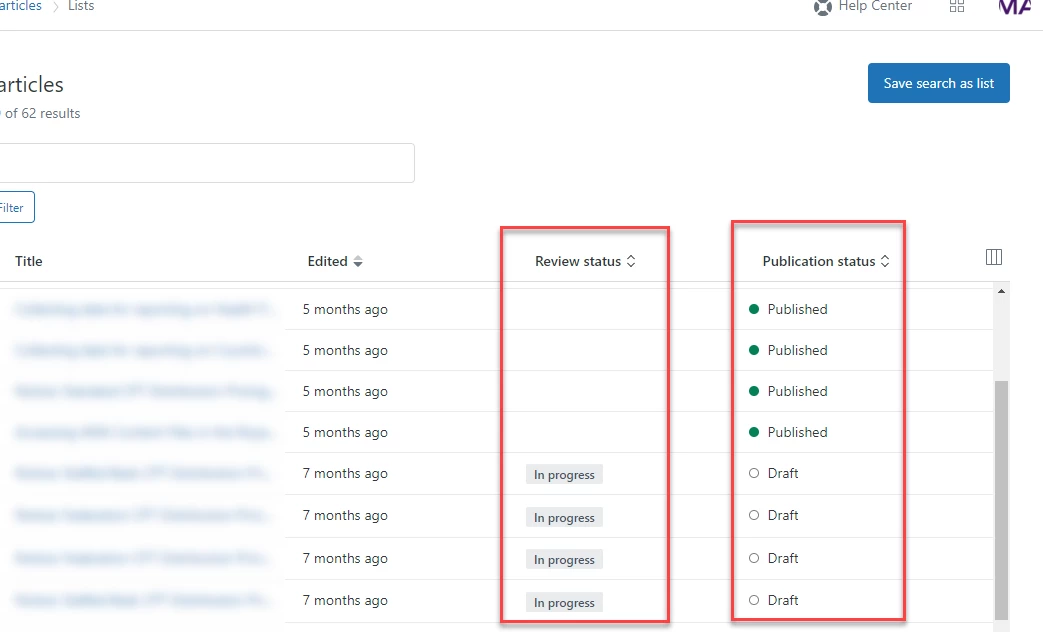After reviewing the documentation, I'm not seeing publication or review status as parts of the schema for articles, or for any other end point. I'm trying to retrieve a list of articles with their title, URL, ID, edit date, and publication status.