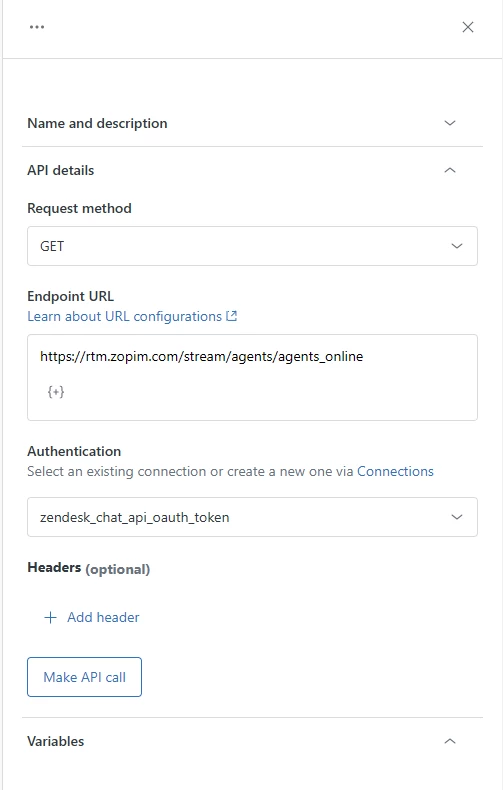 However, I’m facing an issue at the Branching based on agent availability step. The agents_online variable doesn’t exist, even though my API call to https://rtm.zopim.com/stream/agents/agents_online returns a 200 status code.
