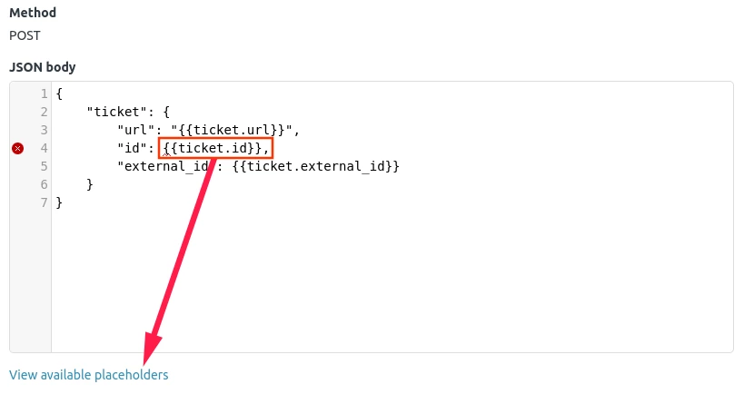 I am copy/pasting the placeholders directly from the list of available placeholders as shown. This is showing that I have an error on the "id" line which appears to be because I am not passing a "string" as the value. If I put double quotes around the "{{Placeholder}}", this will work. The same issue happens with the "external_id" key/value pair because in my example the value would result in a null but because I am not placing double quotes around the "{{placeholder}}" which would result in the string "null" and not a null value.