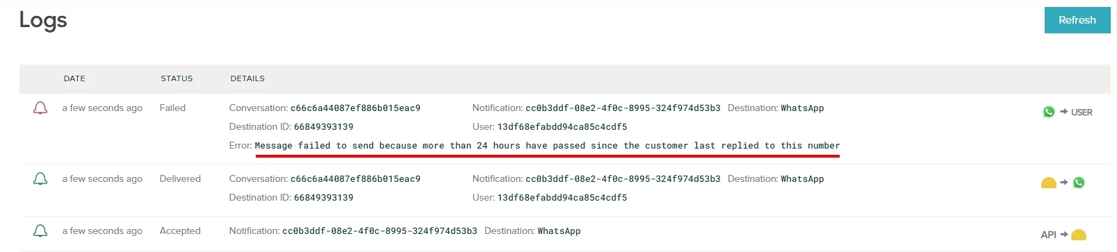 For sunshine conversation, I connected my WhatsApp to my sunshine app and I tried to send the outbound message using notification api and I got the error message showed in my log "Message failed to send because more than 24 hours have passed since the customer last replied to this number".
