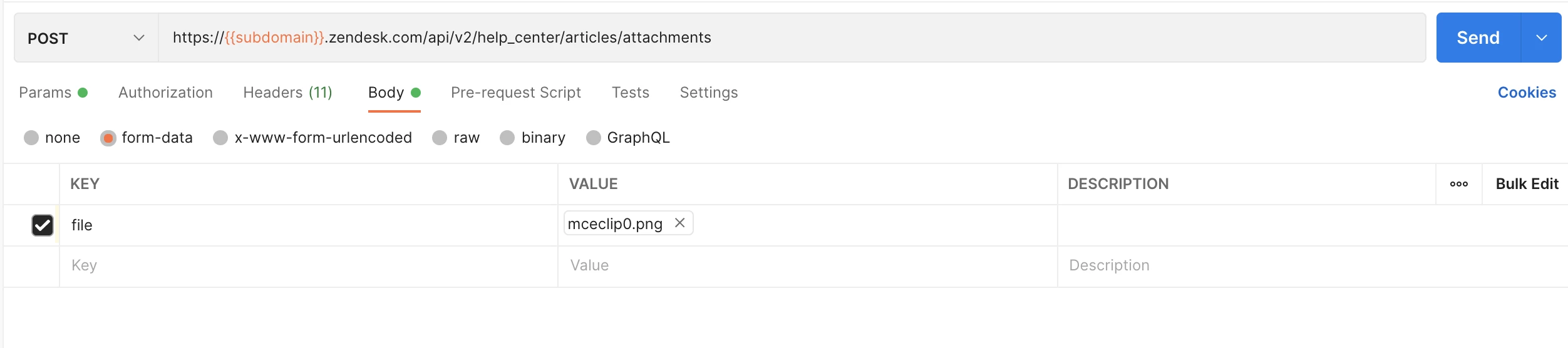 I am trying to use the Create Unassociated Attachment endpoint to upload attachments to my Help Center. This works through Postman if I use the file property and link to a file on my local computer.