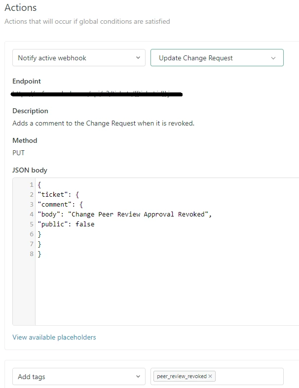 I understand it isn't recommended or supported but I am trying to create a trigger that will add a comment to a ticket (using a webhook), when a Change Request Peer Review has been approved, but is then revoked. The ticket remains open but begins the peer review approval process again.