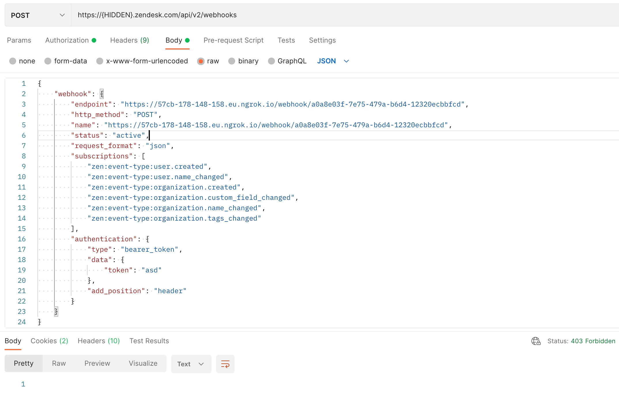 I do go though the oAuth flow, which completes successfully. But when trying to trigger the webhook creation endpoint, just like in the example I do end up with an 403 error where the response body does not contain any data that would give more information to why is this happening.