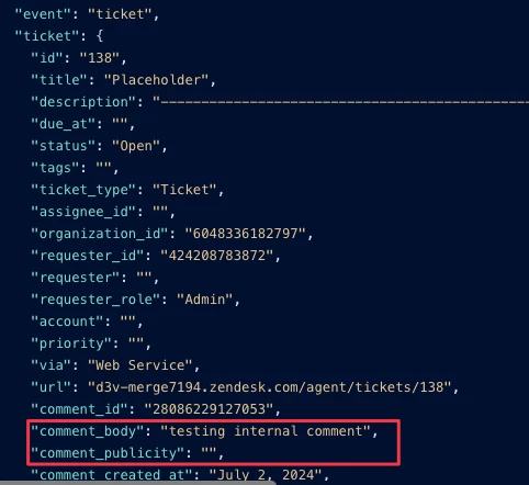 We have webhooks set up to notify when a ticket is updated in Zendesk, but it looks like when a comment is added to a ticket, the webhook doesn't let us know whether the comment is private or public. In the screenshot you can see that the ticket was updated with a comment (and it is an internal comment), but the webhook comment_publicity field is blank. I've also tested this with public comments and that field is still blank.
