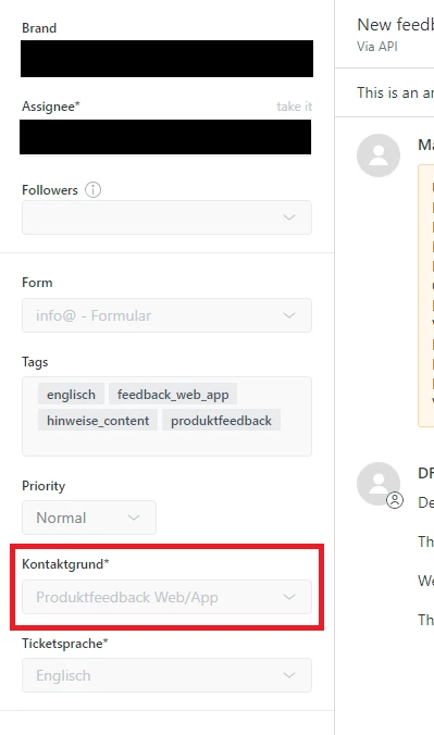 I am trying to use the action "Get items" from the connector Zendesk and want to filter for our custom field "Kontaktgrund" (contact reason) in our Zendesk tickets. A contact reason would be for example "Produktfeedback Web/App" (see Screenshot below).