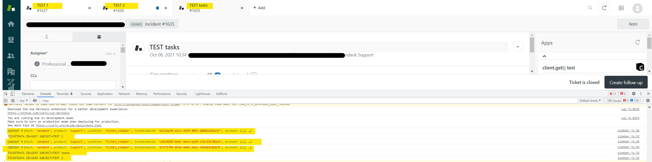If it is intended, how do I identify which ticket is in focus, so I can grab the ticket data with client.get("ticket") (or sub-properties, e.g. client.get("ticket.organization.organizationFields")) for just that ticket? In the example above, for #1635. I would have assumed that at least only one context (which includes a ticket ID) was fetched, but I also get all three of those, as can be seen.