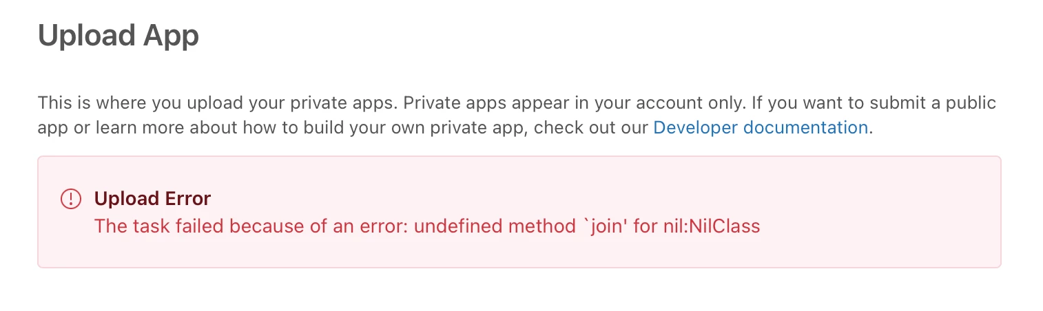 I'm working on a private Support app using the ZAF framework. When I go to upload the app within Zendesk I get this error. I've tried running `zcli apps:validate` but it says there are no validation errors.
