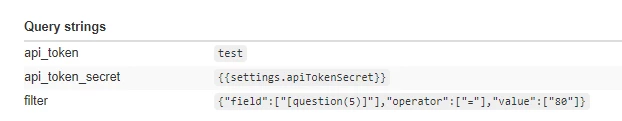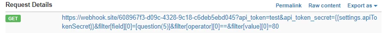 url: "https://webhook.site/608967f3-d09c-4328-9c18-c6deb5ebd045?api_token="+"{{setting.apiToken}}"+"&api_token_secret="+"{{settings.apiTokenSecret}}"+"&filter[field][0]=[question(5)]&filter[operator][0]==&filter[value][0]="+`${ticket.id}`,