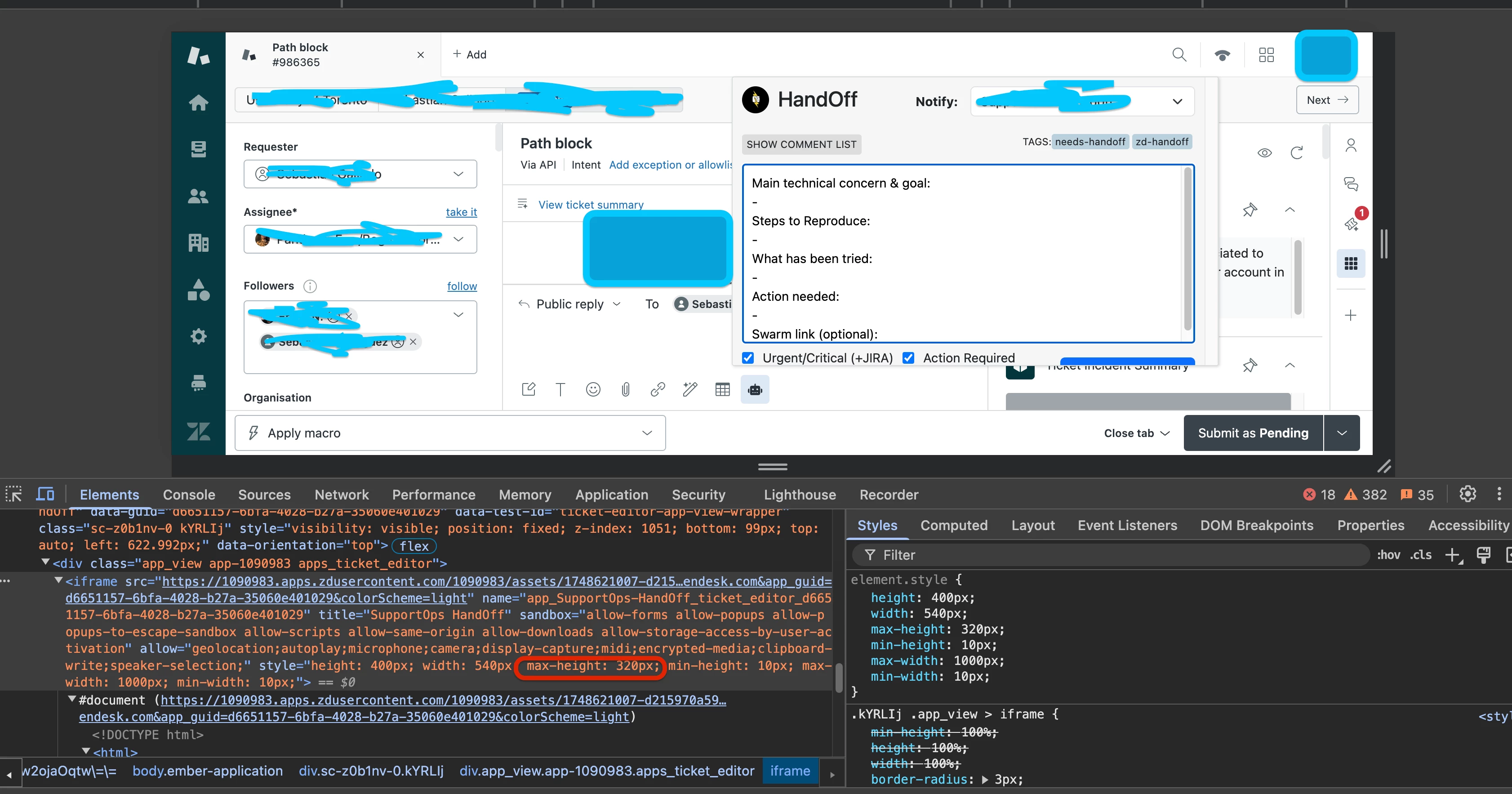 After last Zendesk update on 30th of May our ticket-editor app started to get “max-height=320px” imposed on it. At first it was =360px, and it is hiding the button like on the screenshot. When I started modifying the resolution of the app window, it started to impose 320px instead. I looked through the ZAF/Zendesk dev documentation and all I found is that there is a max-width imposed on some other Zendesk apps (not ticket-editor apps). And it is even more concerning that it started to impose even more agressive 320px instead of 360px.