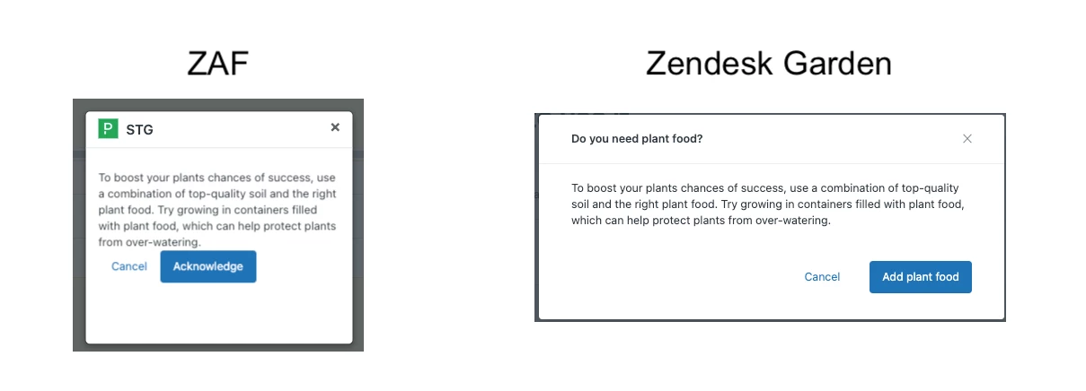 When I create a modal according to ZAF documentation, the UI differs from the one shown on the Zendesk Garden modal page.