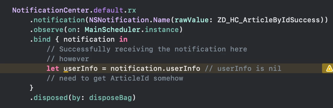 Working on iOS Zendesk help center SDK and trying to get user tapped article id. Listening to "ZD_HC_ArticleByIdSuccess" notification, but there is no inside this notification call. No id is being passed. How I can retrieve it?