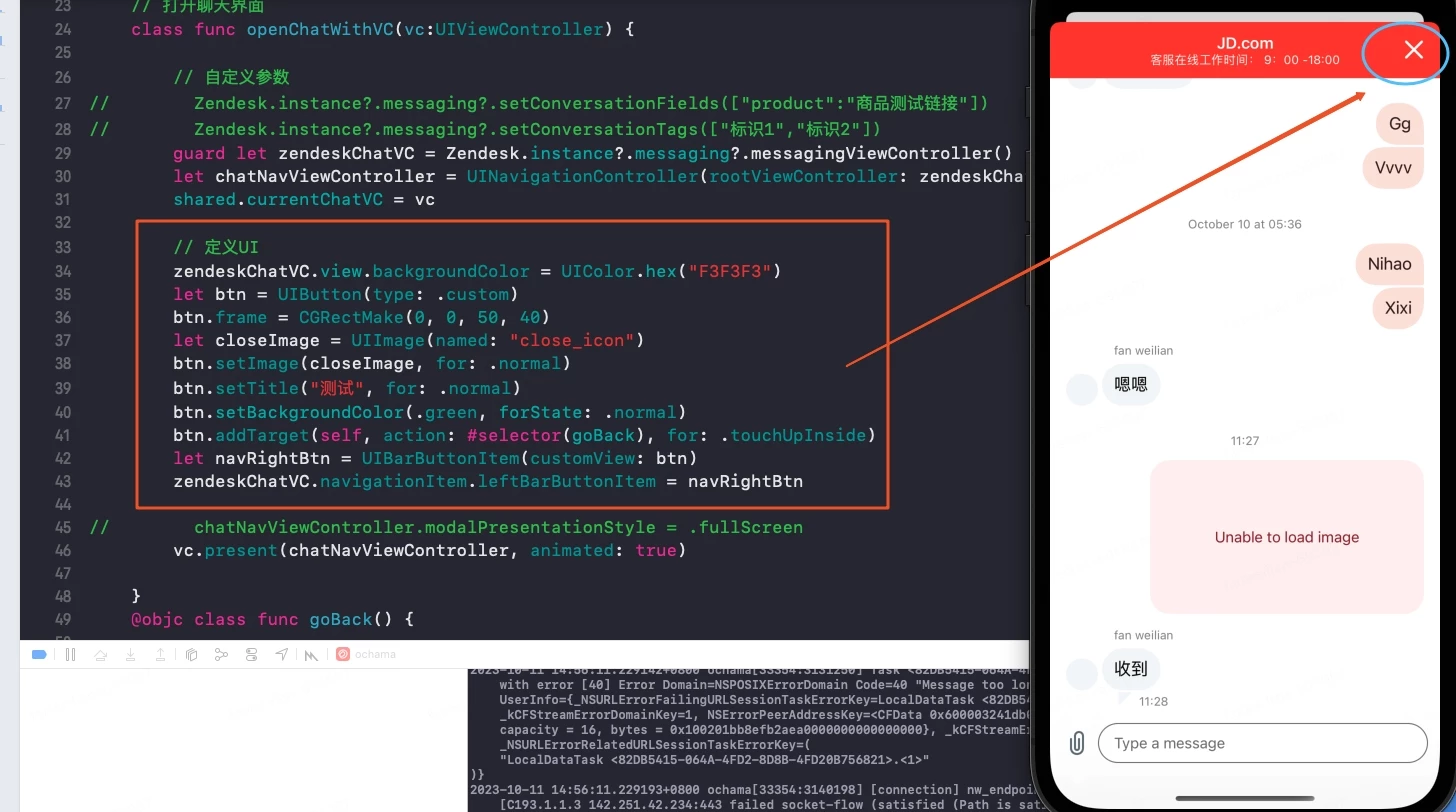 When I use the messaging SDK (for iOS mobile, not web widget), I want to modify the style of the header close button, but it does not take effect. how can i do ? The code is as follows: