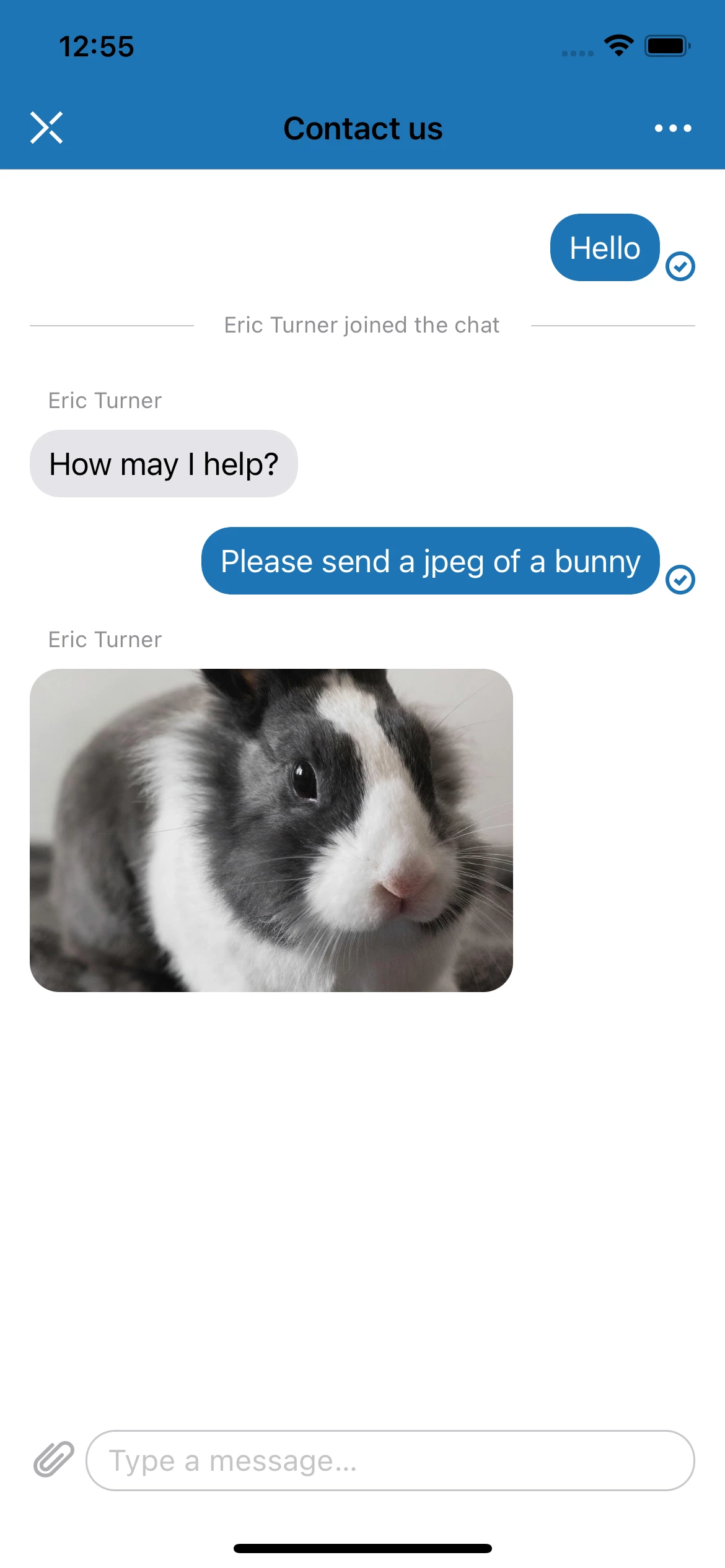 When a jpeg image is sent by an agent to the Zendesk Chat thread on iOS, the (thumbnail) image displays inline in the chat view. But when user taps the image, and a (presumably) preview controller is pushed onto the navigation stack, the image is not displayed as expected.