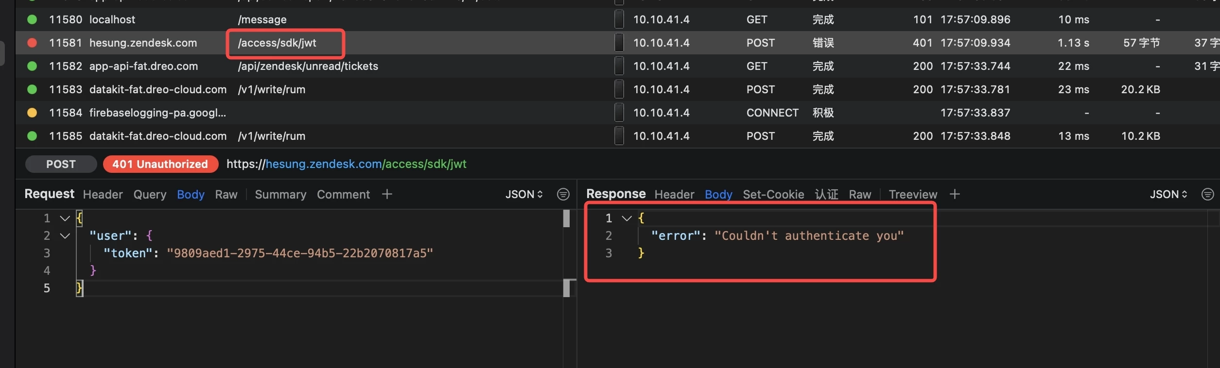When using the token associated with this abnormal account to fetch the list of work orders, the mobile SDK returns an error indicating that I am unable to authorize.