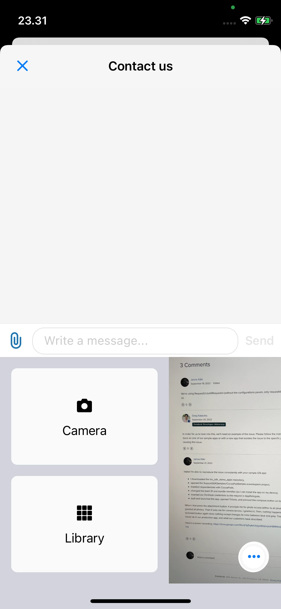 We're using the latest versions of Support SDK and the other SDKs on iOS, but we aren't able to attach any images to a discussion on iOS 16. The attachment button (paperclip) alternates between blue and gray when tapped, but nothing happens after it initially asks to grant access to photos. We have defined the related permission strings for NSPhotoLibraryUsageDescription and NSCameraUsageDescription.
