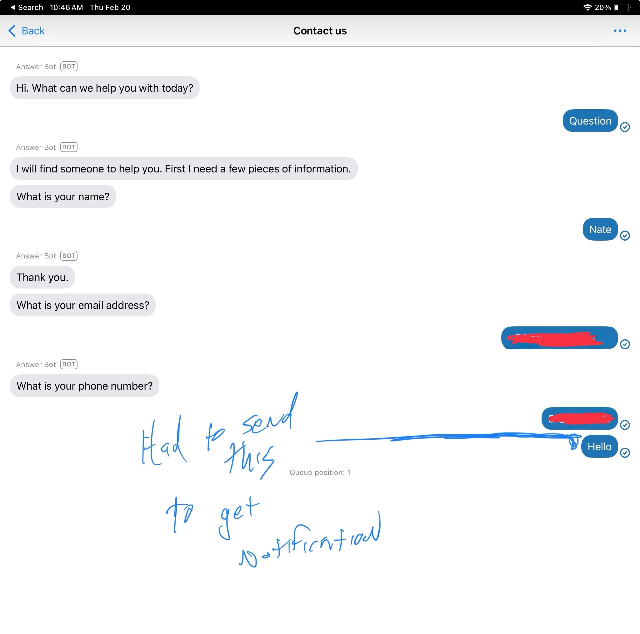 As you can see in the screenshot below, I sat there waiting… then eventually sent the “Hello” and the chat was requested. This isn't a great user experience for sure.