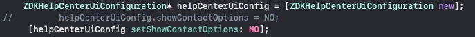 Firstly, I'm not sure I'm able to even change any setting of the help center screen at all. I'm doing this on iOS currently, and according to the docs here I should be able to remove the ticket creation from the screen. However, the method/field I got is `showContactOptions` instead of `hideContactSupport`. While this is fine and might be omission in the docs, the setting doesn't work at all. I have it set here (tried both method and field) as shown here