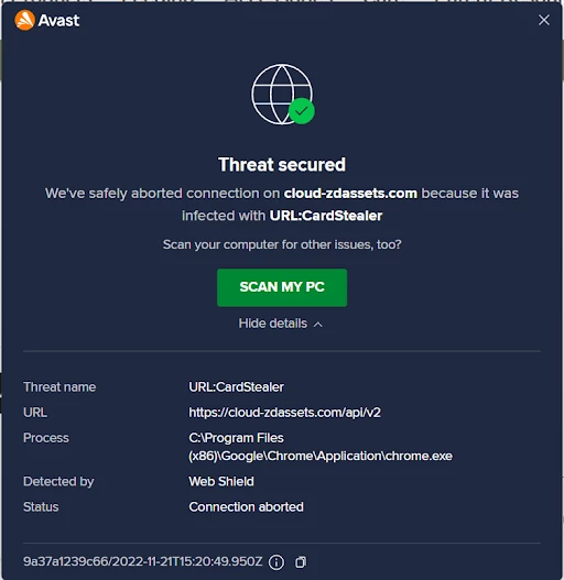 My site has zendesk web widget in every page, but when my customers go to checkout page, Avast alert appears and says the widget has "CardStealer"