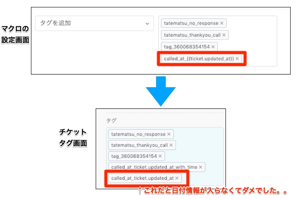 【called_at_{{ticket.updated_at}}】みたいなタグを入れて試してみましたが、無理でした。